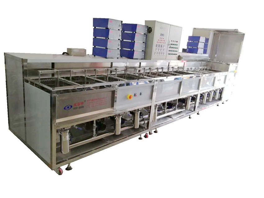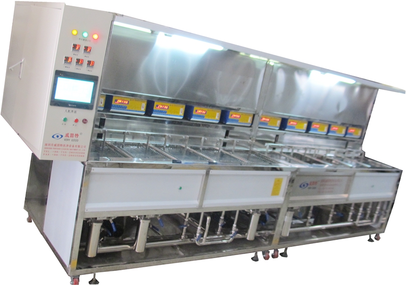 VGT-9140S九槽手動式超聲波清洗機該清洗機是 9 個由不銹鋼材質制作的洗劑超聲槽、強堿超聲槽、市水/回用純水超聲槽、純水超聲槽等組成的一條連續工作的由清洗的裝置。